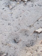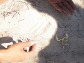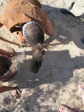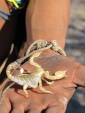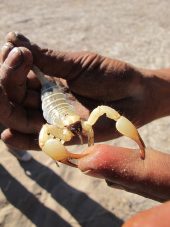 Matchbox size entrances, on the harder parts of the ground, were indicating the presence of scorpions and we went after one. A foot-long piece of reed was used to show the direction of the tunnel and follow the burrow to where the scorpion lay. It took five minutes to dig an angry little scorpion out of its tunnel. The way you calm its temper is to put the scorpion in your mouth and sooth it with your tongue to made it docile and curiously relaxed. Best leave that to the bushmen.