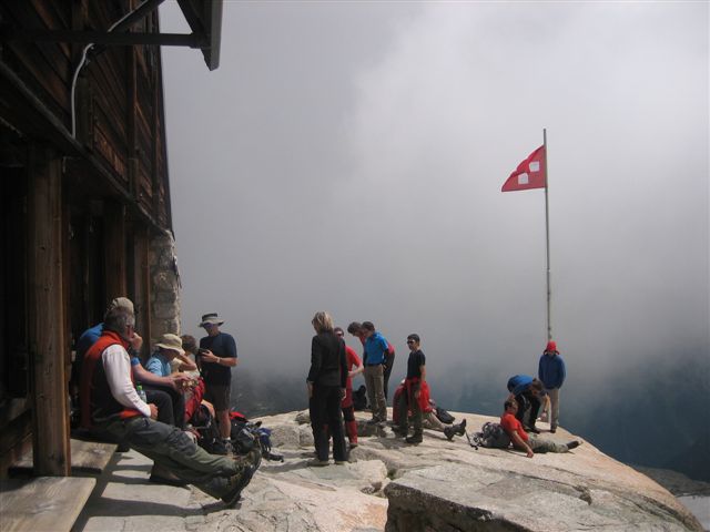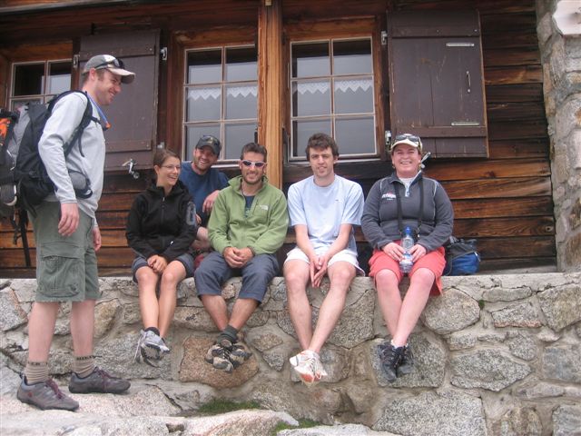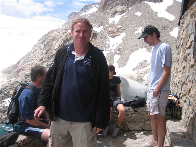 Schalk, my cousin Burger, his wife Norma & I arrived in Martigny on the 4th of July and were entertained with a barbeque in the forest above Vollèges with all my favourite people from the valley. Early on the 5th, feeling rather rough after only 4 hours’ sleep, we set out on our quest. We followed in Hannes & Mark’s footsteps by taking the Breya ski-lift from Champex and hiking for just over 2 hours into a spectacular landscape, past gaping crevasses in the Orny Glacier, dramatic drops and eventually arriving at the imposing monolith of Petit Clocher on the left. The last few hundred metres are steep and although the hut is only 2 831m in altitude, the height was getting to me. But once you get to the hut, there’s a sense of adrenalin in the air, and a feeling that great men & women have gone here before.