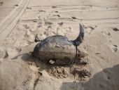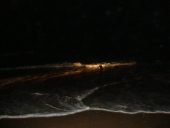 At 10 we climbed the dunes and hit the beach. The moon had come out but was shut out by the towering dunes to our left as we started. Our path was a four metre wide channel between the sea and the sand ledge, that the waves had beaten when high. The headlights caught thousands of scampering ghost crabs, as they dashed for the cover of the water before the wheels crushed them in our own race to clear the zone.  As each wave came in we climbed the narrow track to avoid them. An hour later we were through, after passing the grave of the lost vehicle, 4 tyres upturned, buried in sand and water.
