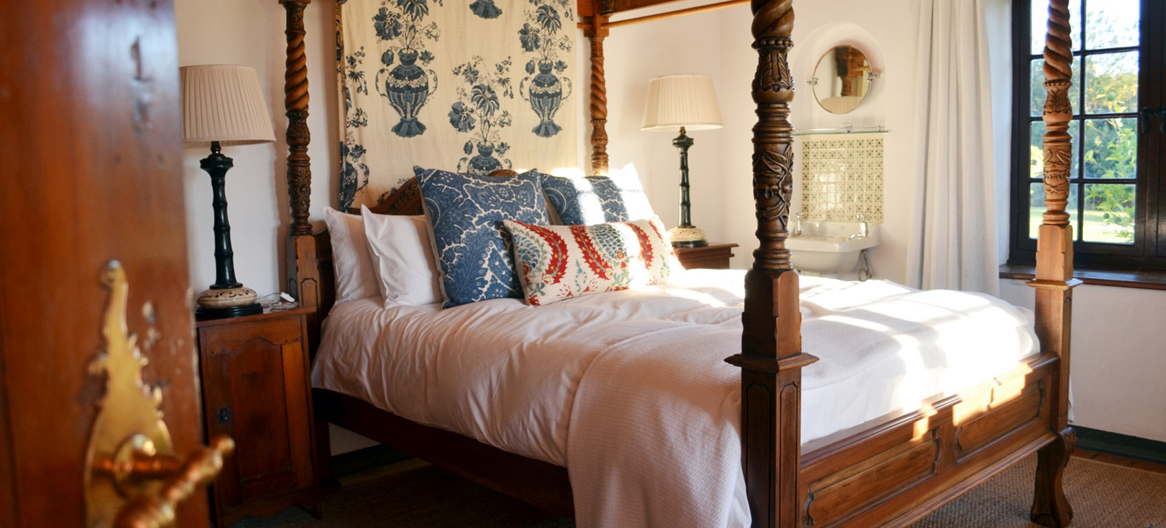 The main cottage has two large bedrooms inside, plus an additional bedroom, known as the Butler’s room, set off the back courtyard. The main bedroom is home to an ornate wooden four-poster bed (queen-sized) and period armoire, while the second bedroom has twin singles that can be made up into a king on request. These two rooms share a bathroom with shower, loo and basin. Each bedroom has a washbasin, air-conditioning and pure cotton linen. The Butler’s room, with its breath-taking view of the Simonsberg mountains, also consists of twin beds which can be made up into a king-sized bed. Its separate bathroom is just across the courtyard and contains a deep, black oval bathtub, his and her vanity and loo. Each bathroom has underfloor heating and heated towel rails.