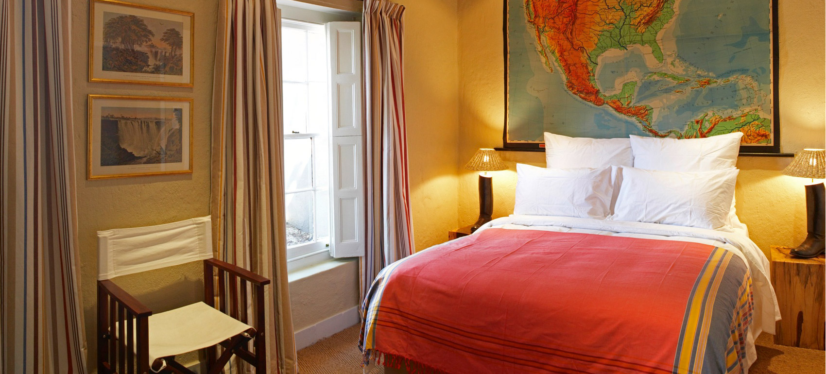 The soul of Explorers Club lies in the large open-plan living, dining and kitchen area, giving the conviviality of a camp kitchen, gorging area and place to relax, but with all the creature comforts a true holiday requires. The living area is divided into two sofa areas: one of which opens out on to the patio, the other remains in the cosy interior, adjacent to an open fireplace, and beneath a wall-mounted, flatscreen TV. With air-conditioning, DStv, Wifi and a collection of classic DVDs to hand, there’s plenty to inspire you to start dreaming about your next expedition.