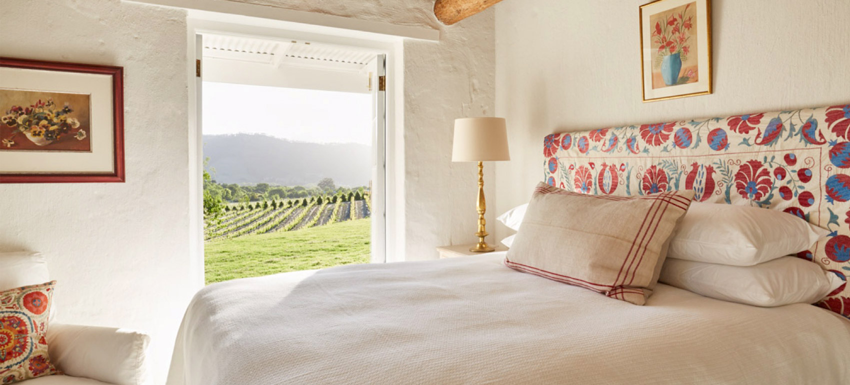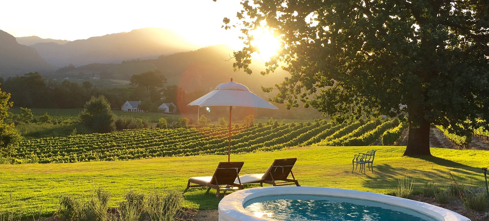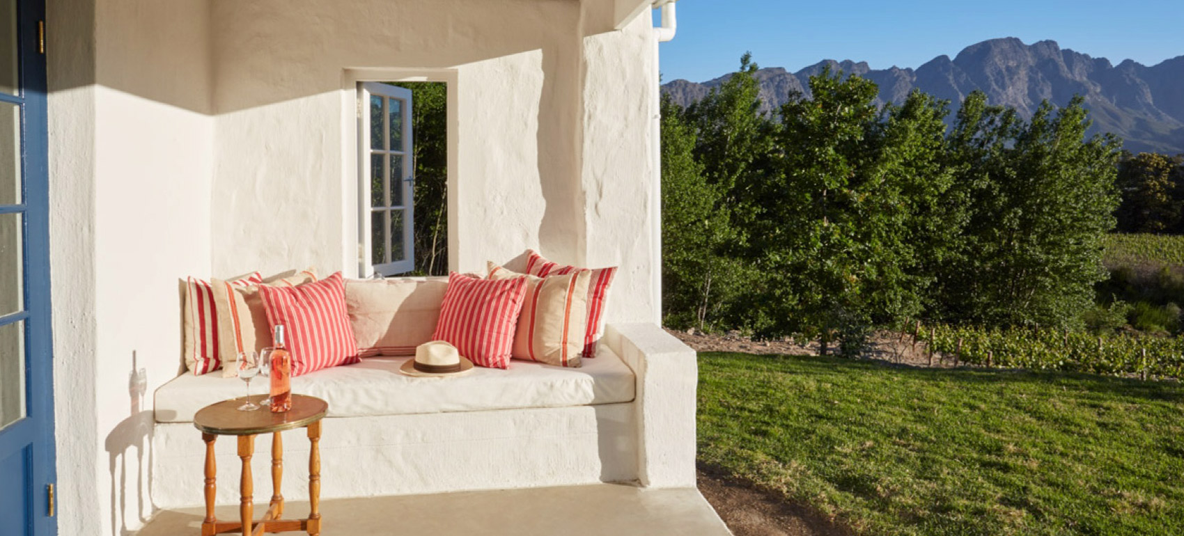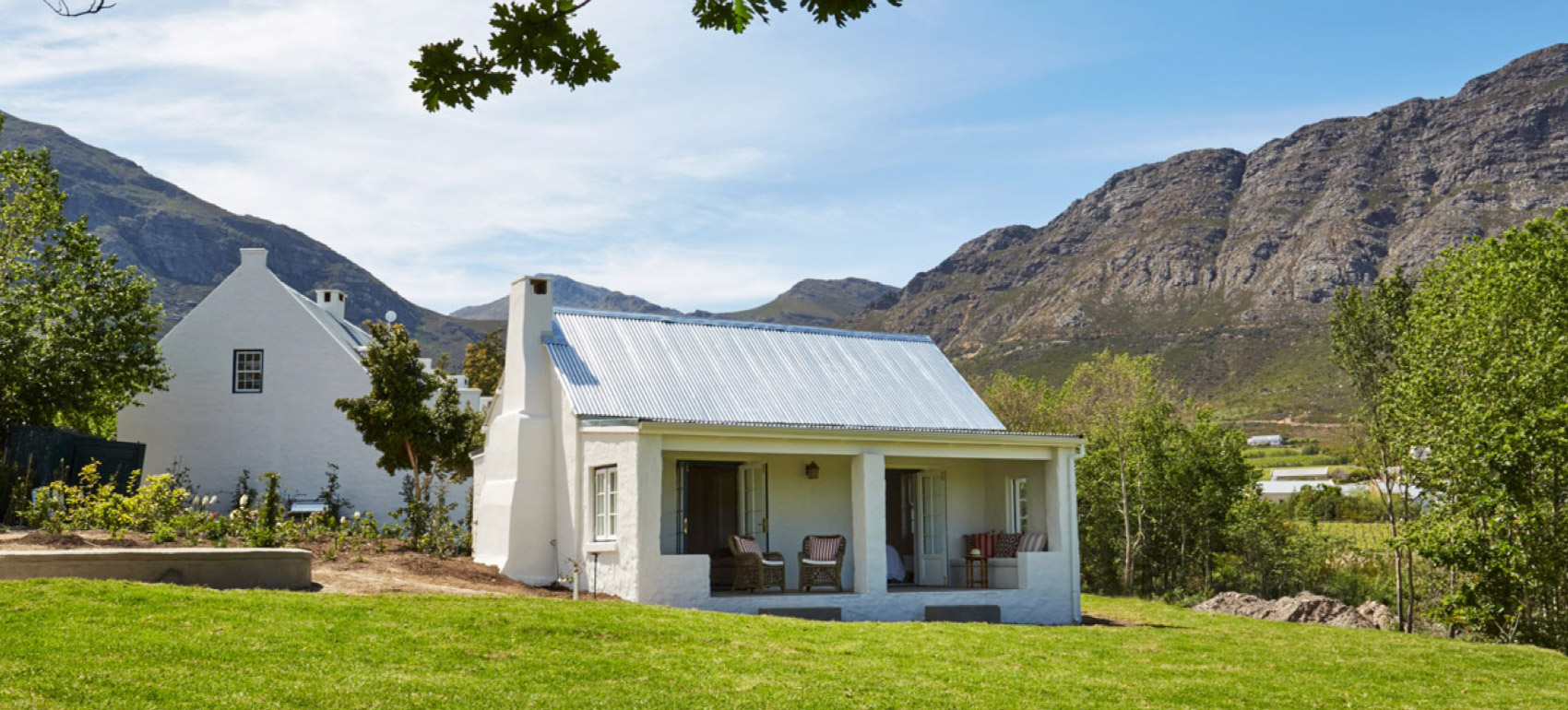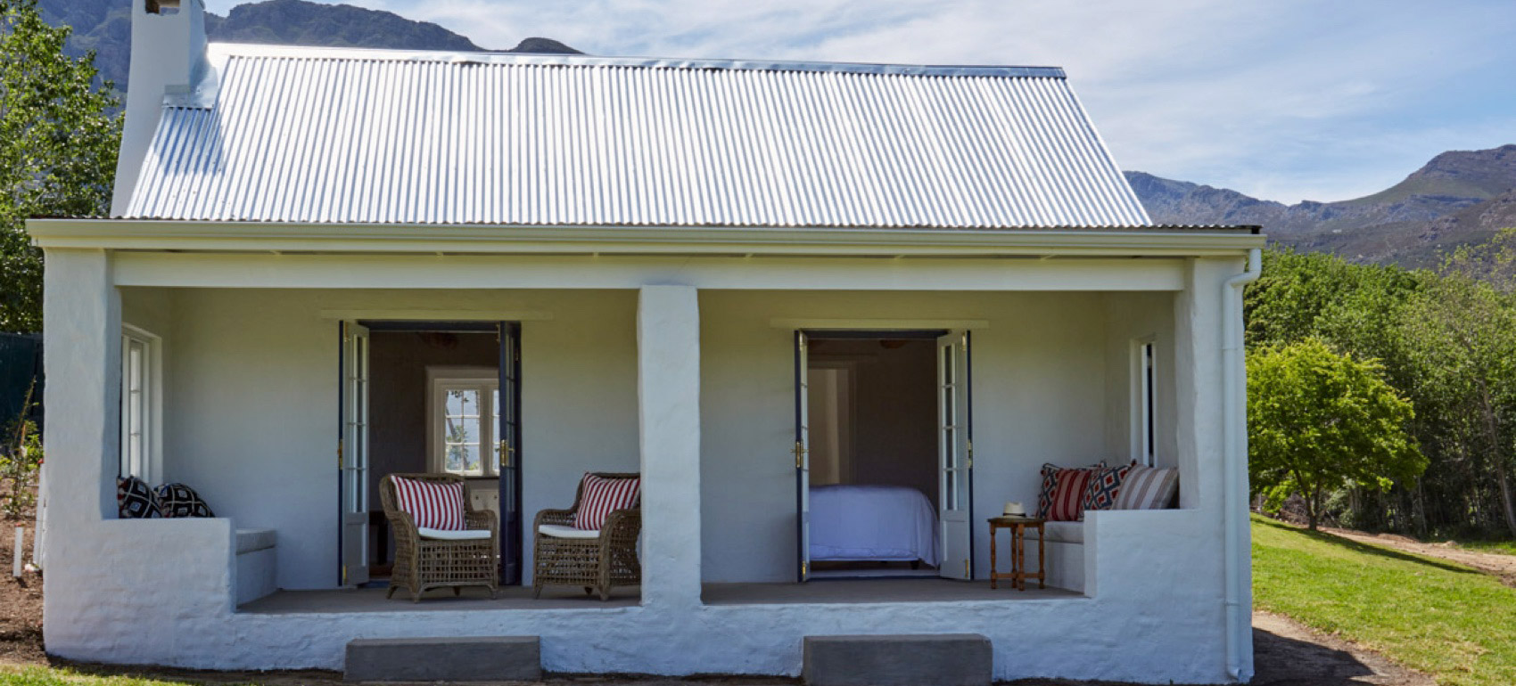With arguably the best view in Franschhoek, this intimate cottage with its private, sun- drenched patio, plunge pool and whitewashed charm, is located on the forest edge of one of the village’s oldest farms, La Cotte Estate. Large sash windows, open beams with bamboo ceilings, double bedroom with 100% percale linen, large wood-burning fireplace, handmade Indian quilts and colourful textiles all give this cottage its sense of life, adventure and serene romance. The ideal honeymoon or romantic retreat.