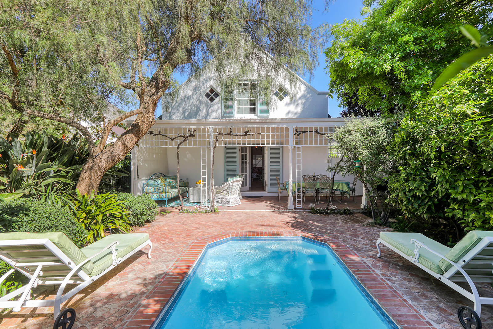 Opening out onto a lush-green, secluded, townhouse-style garden with splash pool, this cosy one-bedroom cottage sleeps two people in a King-sized bed, tucked into the eaves. Decorated in a wash of creams, blues and yellows, reminiscent of an English cottage, with portraits of the owner’s days as a glider pilot, this little cottage is a quiet, comfortable and unpretentious base from which to explore Franschhoek’s sophisticated restaurants, galleries, markets and shops – which are all just up the road.