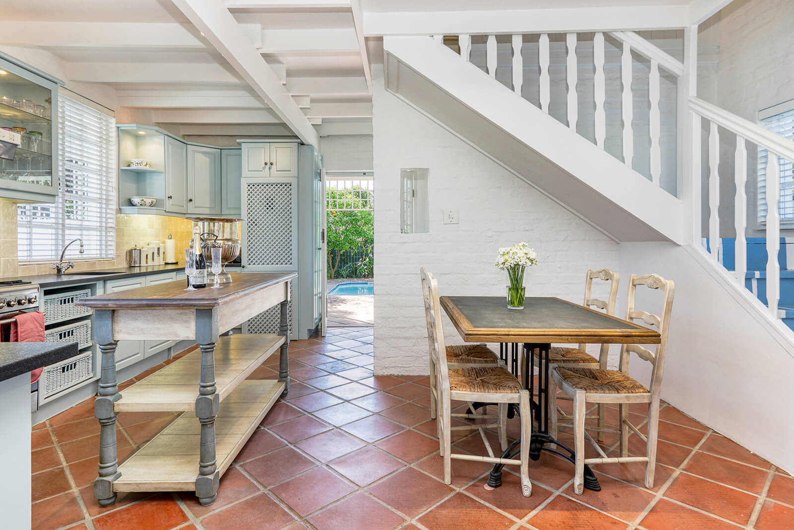 The open-plan, country-style kitchen with fridge / freezer, gas hob, electric oven, free-standing prep island and small farmhouse dining table (seating for 4), is fully-equipped with everything you need to whip up a stay-at-home meal, or a pool-side BBQ in the garden. The kitchen leads, through French doors out onto a covered patio with wrought-iron dining table and chairs (for 6), and separate, relaxed seating area – ideal for long lazy lunches under the trees, or alternatively Franschhoek’s plethora of restaurants, pubs and cafes are within walking (or Tuk-Tuk) distance.