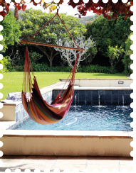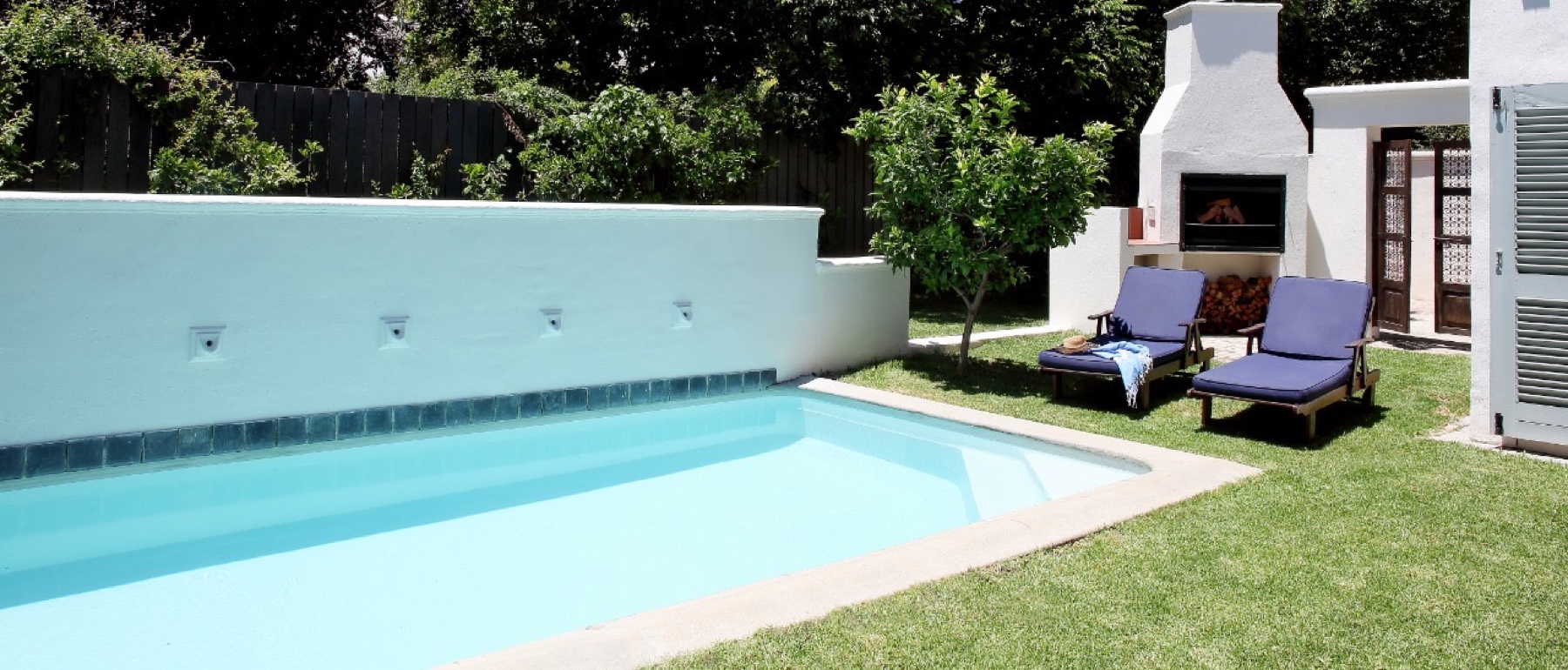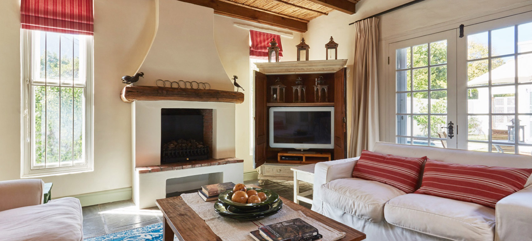 A generous main living area with air-conditioning links the west-wing to the main ensuite, with two comfortable sofas and large, glass sliding doors that open up to take in the sunny garden, pool and mountain views. The wood-burning stove transforms this area into a cosy, warm retreat in winter, and heats the rest of the house. In the garden is a Weber barbeque, or in South African-speak: ‘braai’, for outdoor grilling. Most of Franschhoek’s village restaurants are within walking distance of the cottage.