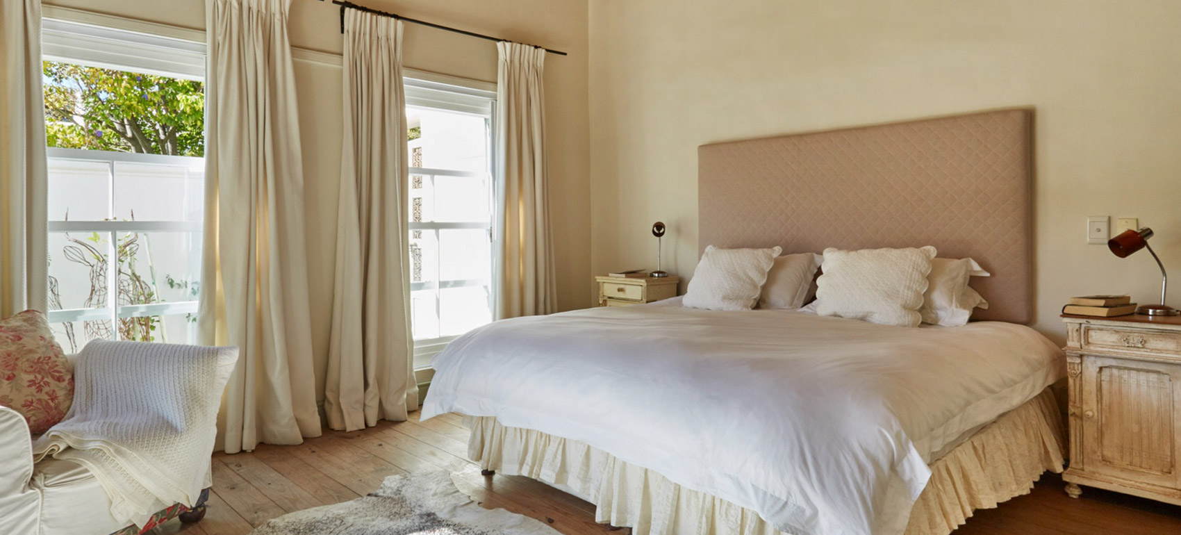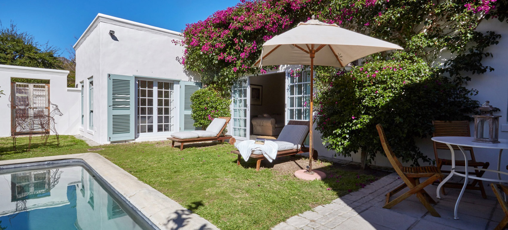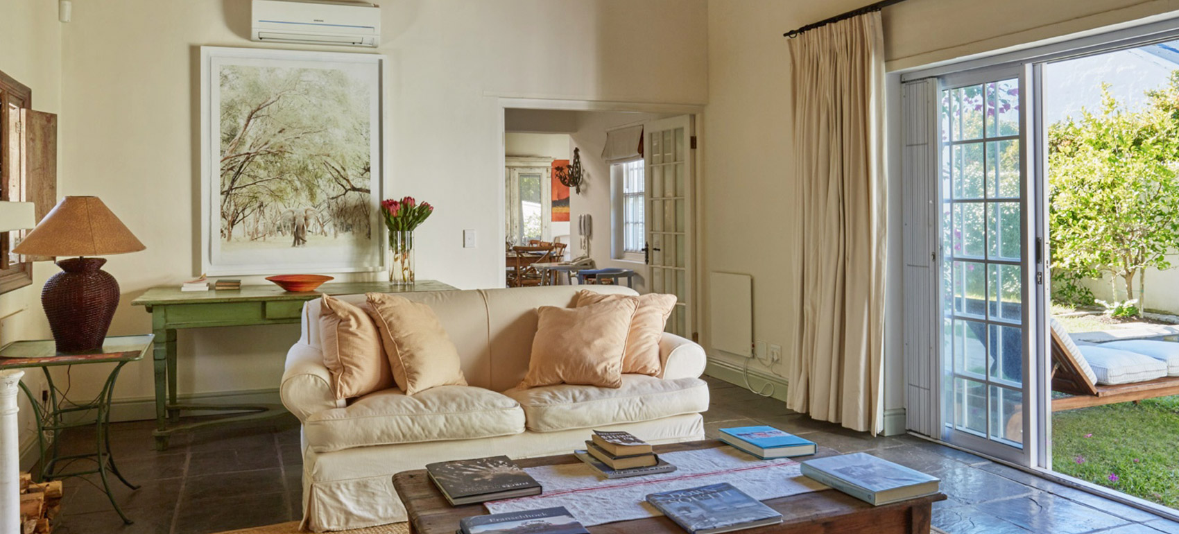 Located on one of Franschhoek’s oldest roads, this historic and popular, two-bedroomed cottage’s unimposing wooden entrance and tin-roof veranda belie the elegance and spaciousness found inside.
