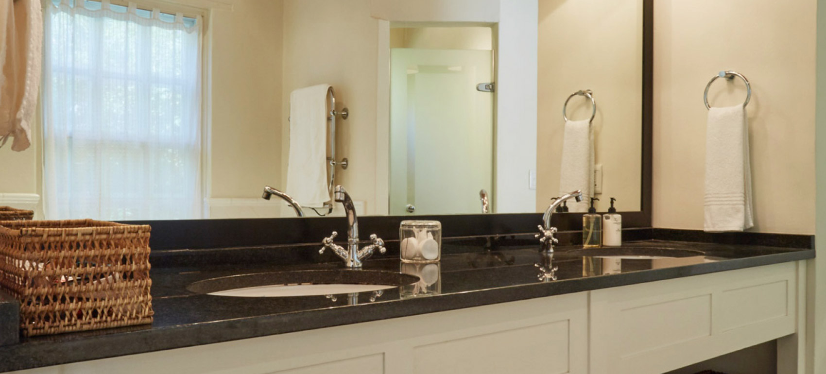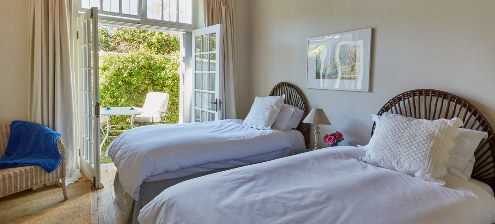 With two sunny ensuite bedrooms, Tockie’s can sleep a family, or two couples. The ample main bedroom houses a king-sized bed, plenty of cupboards, sash windows and French doors that open directly onto the sunny courtyard garden and pool. The large ensuite, tucked neatly behind the cupboard unit, has a marble-topped his and hers vanity, bath, enclosed shower area and separate loo.