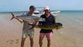 Dorado/dolphinfish known as the chicken of the sea. Caught on surface lure, leaping out of the water. Waves of iridescent  blue-green colours course over the head, body and fins. Golden below with numerous spots. The colours disappear quickly when landed.